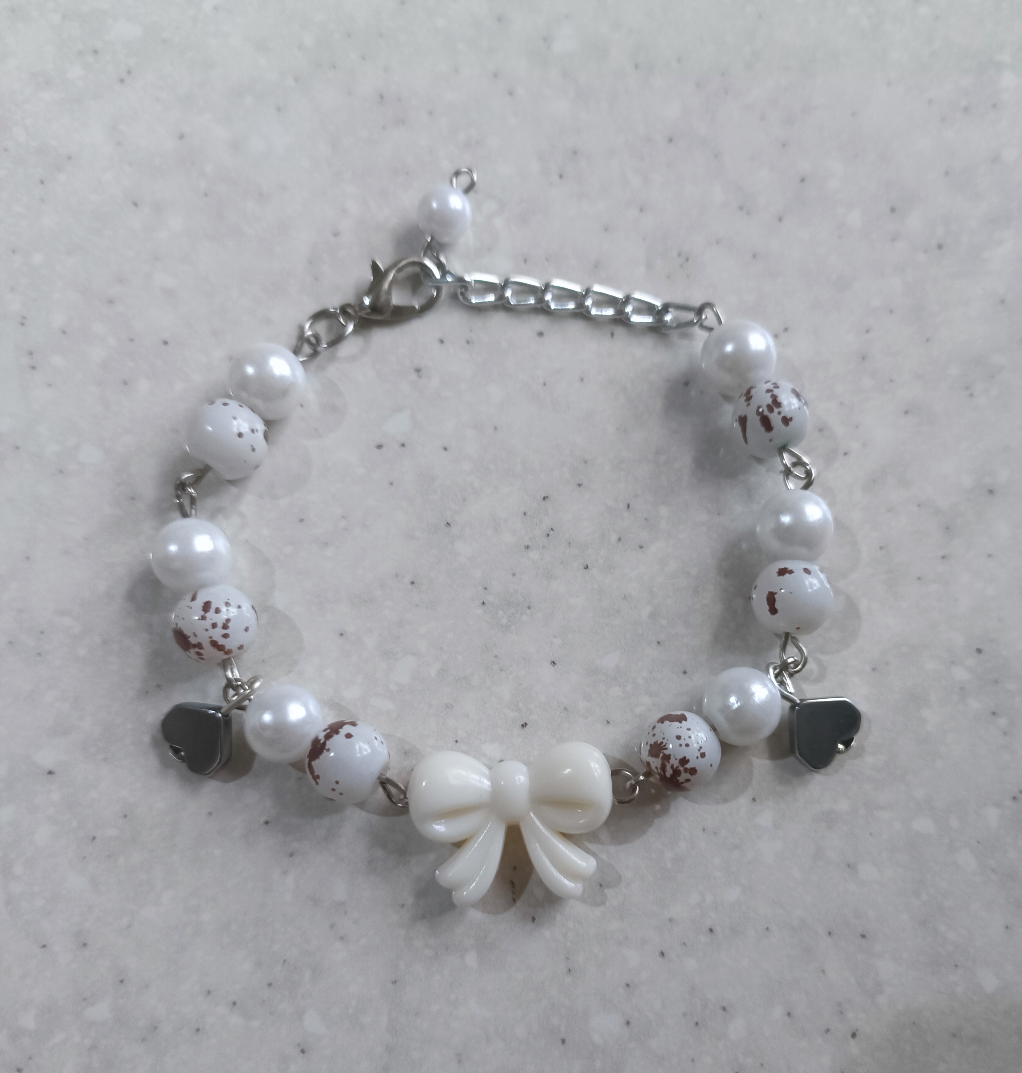 مروارید سفید و شیری با خرجکار پاپیون 🎀 بسیار زیبا و جذاب 🔥 کاملا دست ساز و محکم ♥️ مناسب برای هدیه دادن و مهمانی 🌸 در آب شستشو ندهید 🙏🏻
