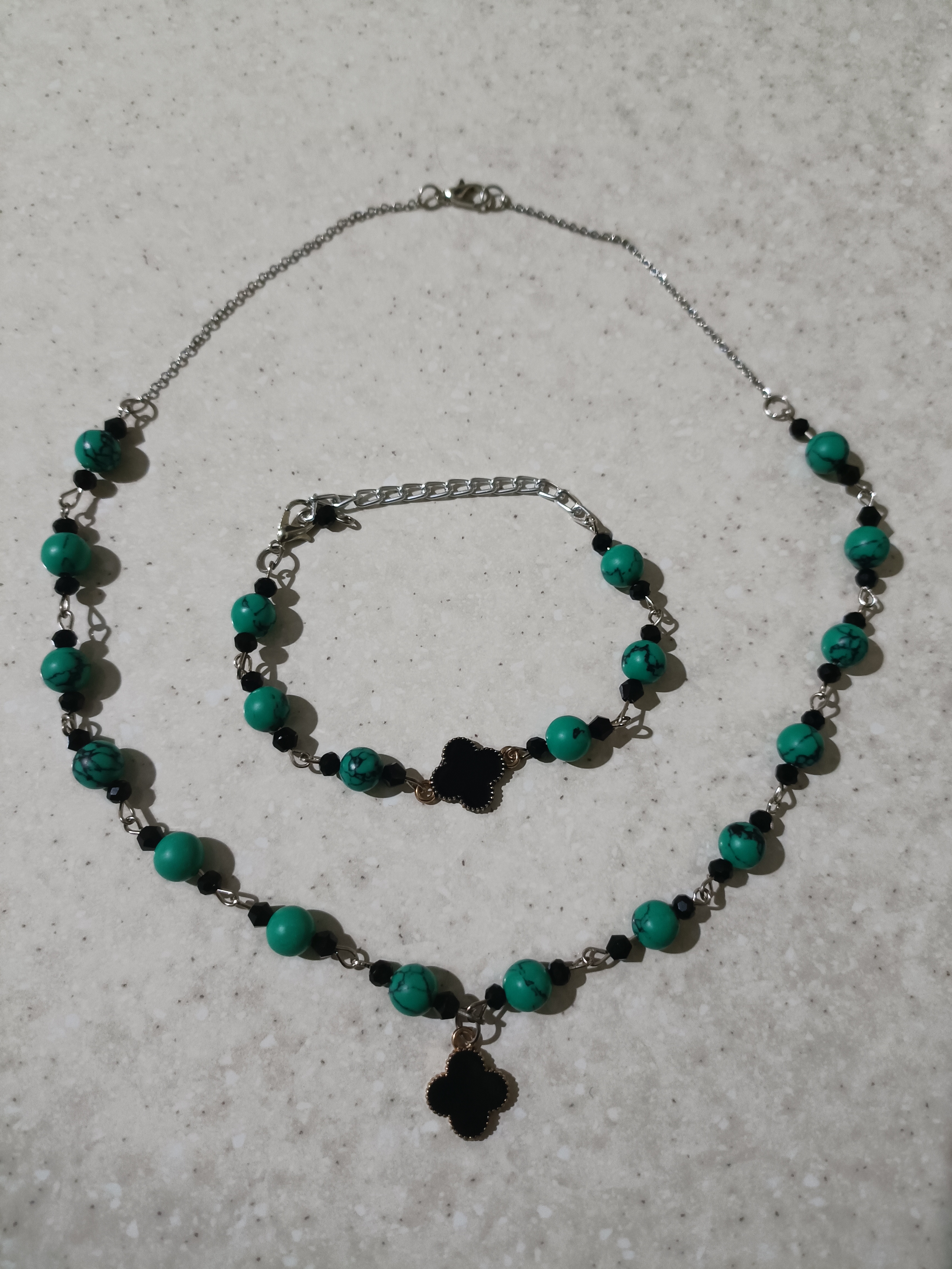 شامل دستبند و گردنبند مرواریدی سبز رنگ با خرجکار کریستال و پلاک و تکلیف🤩 زنجیر گردنبند استیل ورنگ ثابت ♥️ بسیار زیبا و جذاب 🔥 قابل استفاده برای مهمانی و هدیه دادن 🎀در آب شستشو ندهید 🙏🏻