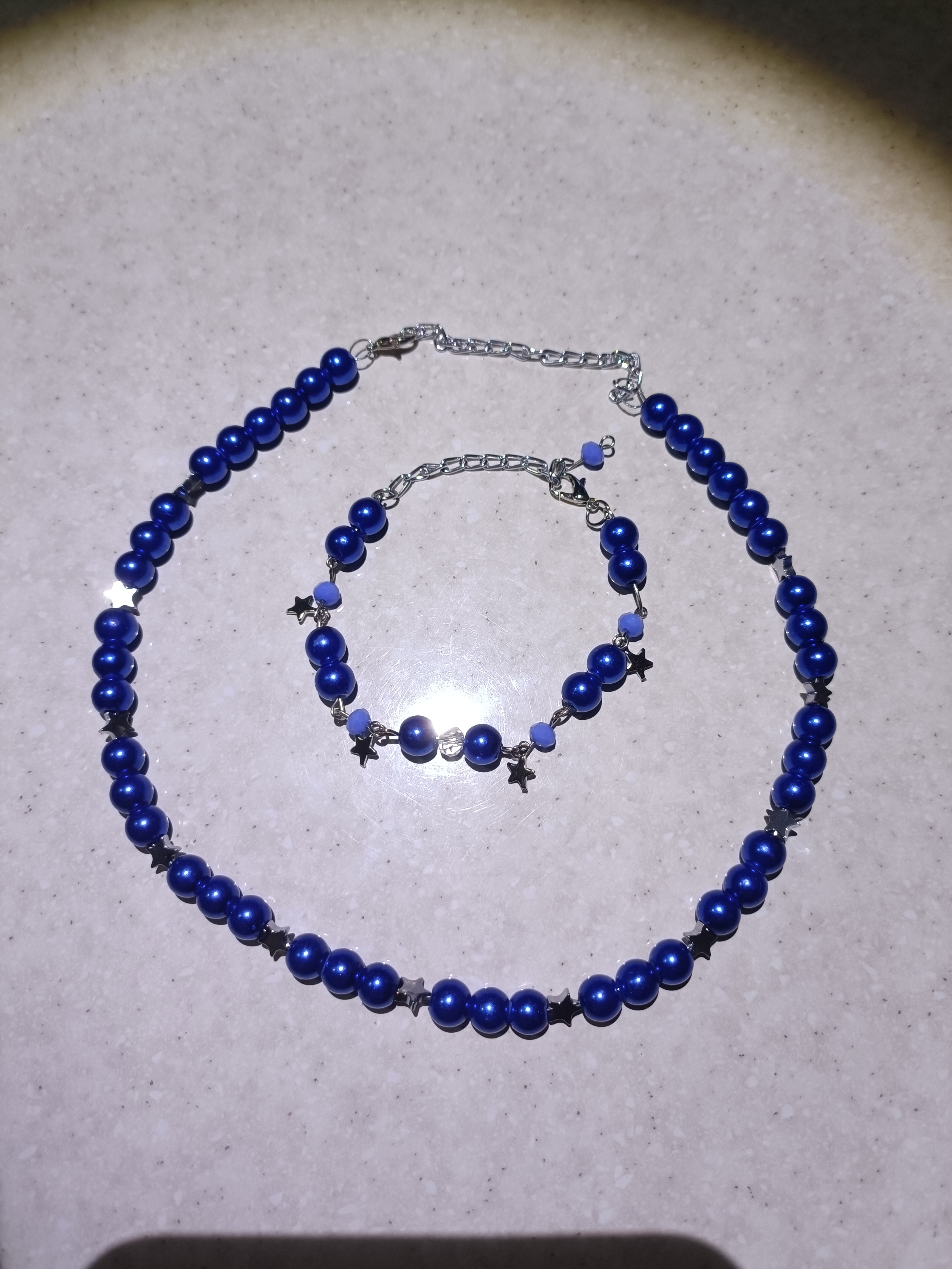 شامل گردنبند و دستبند مرواریدی آبی تیره با خرجکار ستاره ای 🌠 شیک و زیبا 🔥 کاملا دست ساز و محکم ♥️ مناسب برای هدیه دادن و مهمانی 🌸 در آب شستشو ندهید 🙏🏻