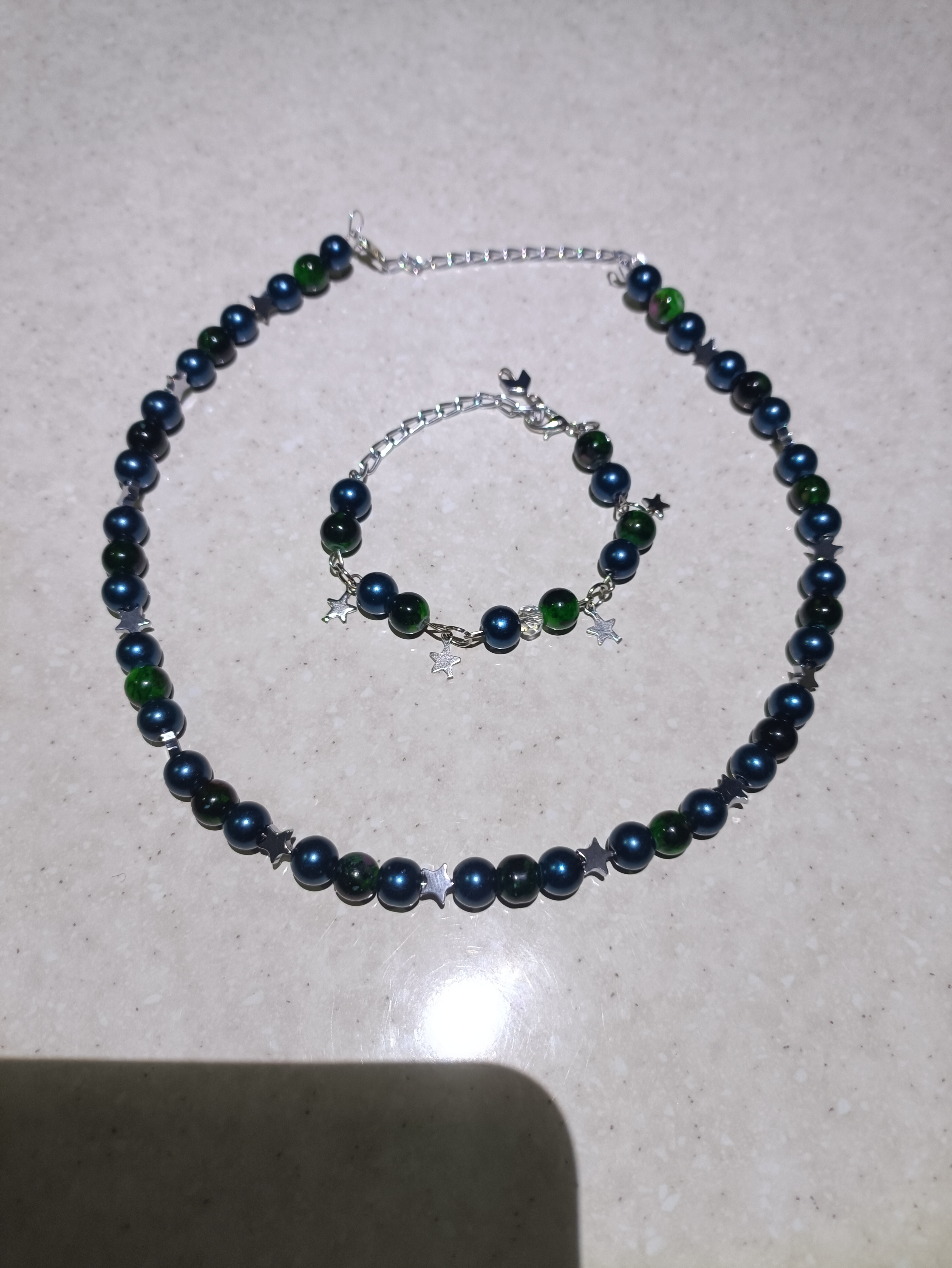 شامل گردنبند و دستبند مرواریدی سبز تیره با خرجکار ستاره ای 🌠 شیک و زیبا 🤩 کاملا دست ساز و محکم ♥️ مناسب برای هدیه دادن و مهمانی 🌸 در آب شستشو ندهید 🙏🏻