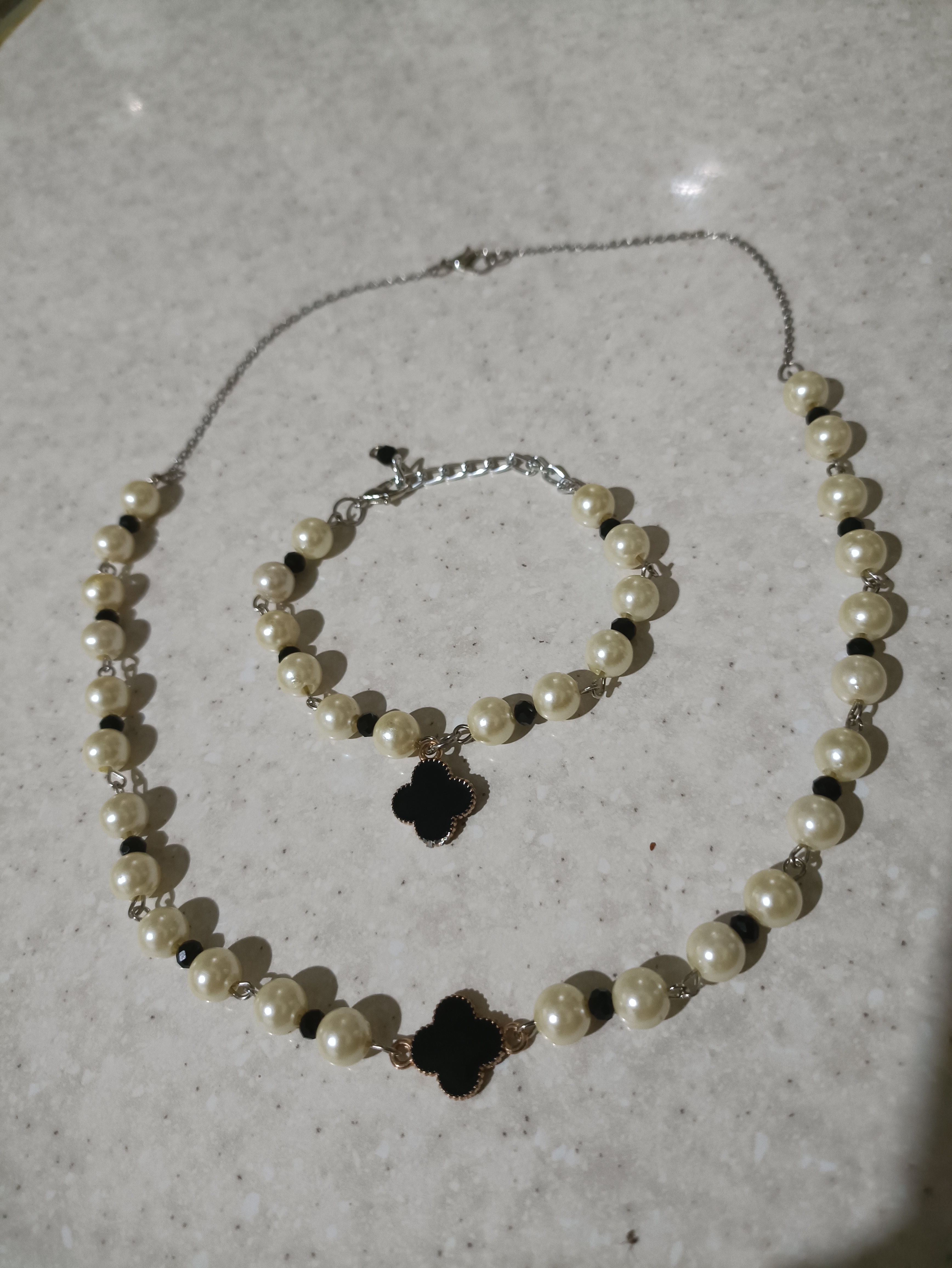 شامل گردنبند و دستبند مروارید سفید و کریستال مشکی در وسط و پلاک ونکلیف 🎀و بسیار زیبا و جذاب 🔥 کاملا دست ساز و محکم 🤩 مناسب برای هدیه دادن و مهمانی ♥️ در آب شستشو ندهید 🙏🏻